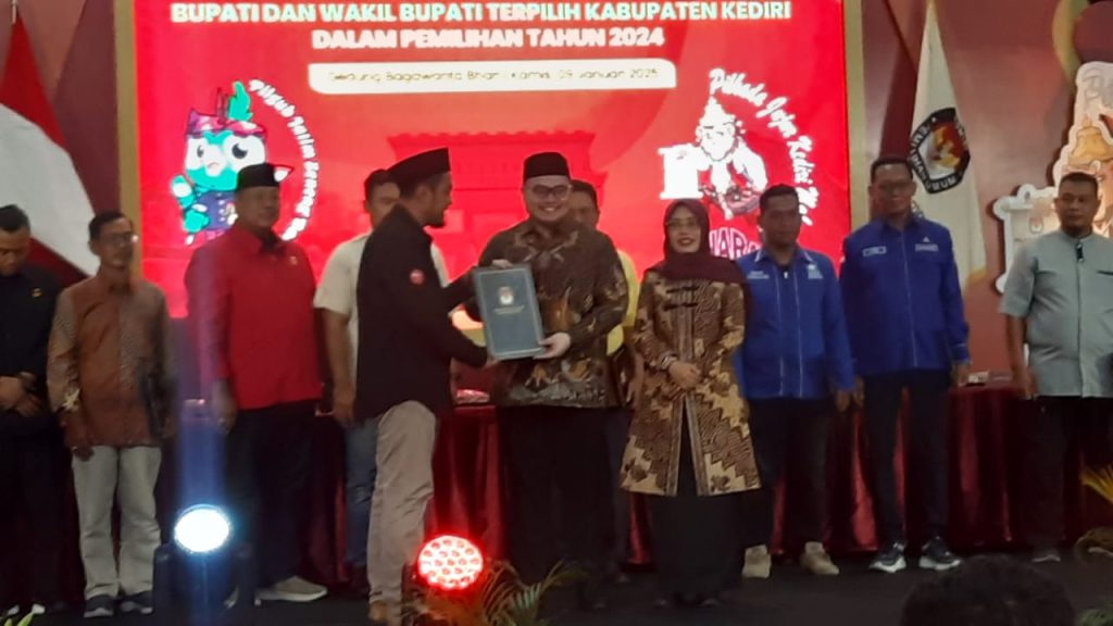 Kediri – Pasangan calon nomor urut 2 Hanindhito Himawan Pramana dan Dewi Mariya Ulfa (Dhito-Dewi) secara resmi ditetapkan sebagai Bupati dan Wakil Bupati Kediri terpilih dalam kontestasi Pilkada 2024. Dhito-Dewi ditetapkan oleh KPU Kabupaten Kediri sebagai Bupati dan Wakil Bupati Kediri terpilih dengan perolehan unggul 489.900 suara atau 56,53 persen dari jumlah total suara sah.