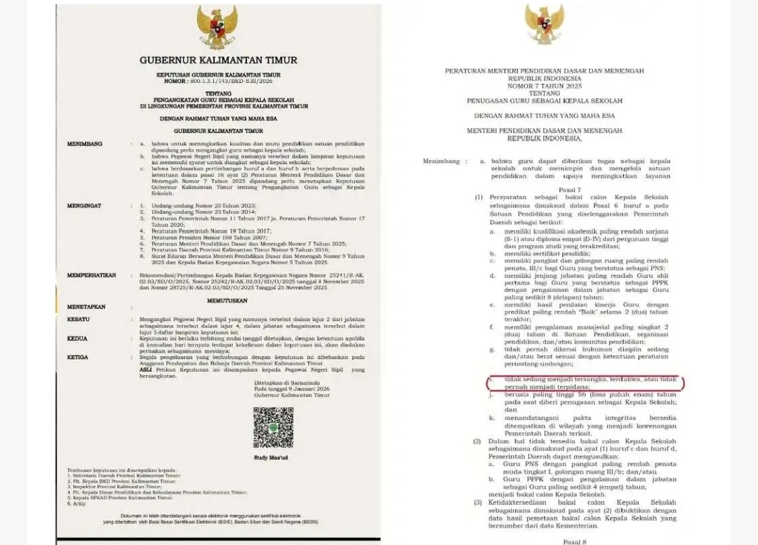 Samarinda – Kebijakan pengangkatan kepala sekolah SMA dan SMK di Kalimantan Timur menuai sorotan tajam. Keputusan Gubernur Kalimantan Timur yang melantik ratusan kepala sekolah justru memunculkan polemik serius setelah terungkap adanya dugaan eks terpidana yang ikut diangkat sebagai kepala sekolah. Kondisi ini dinilai mencederai prinsip kehati-hatian dan berpotensi melanggar regulasi nasional.
