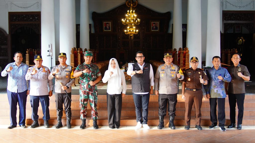 Mojokerto – Penjabat (Pj.) Wali Kota Mojokerto Moh. Ali Kuncoro bersama Bupati Mojokerto Ikfina Fahmawati serta jajaran Forkopimda Mojokerto Raya meninjau sejumlah gereja dan pos pelayanan Nataru pada Minggu (24/12). Kunjungan ini dilakukan untuk memantau secara langsung situasi dan kondisi keamanan dalam perayaan Natal 2023 dan Tahun Baru 2024.