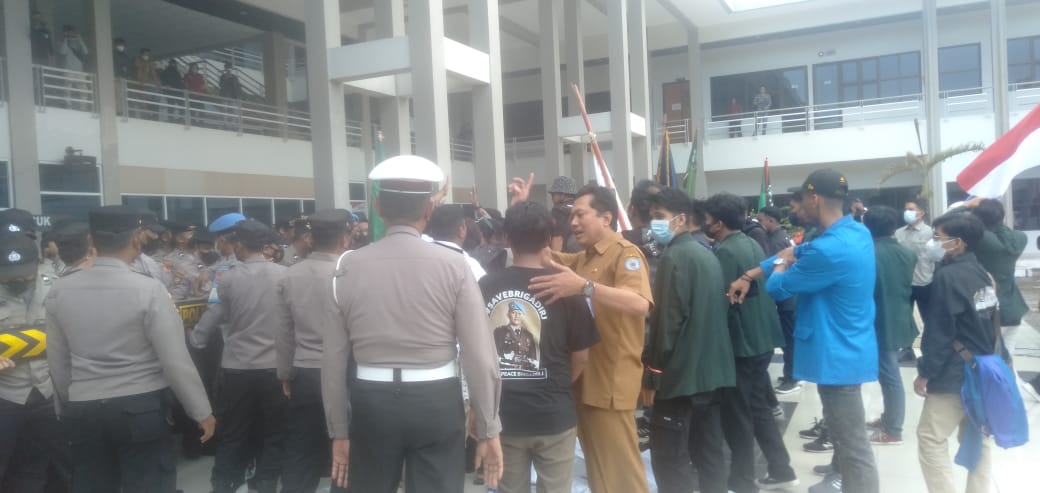 Di Gedung DPRD, mahasiswa menuntut untuk difasilitasi ruangan penyampaian aspirasi. Namun permintaan tersebut menuai aksi saling dorong antara massa aksi dan aparat keamanan.