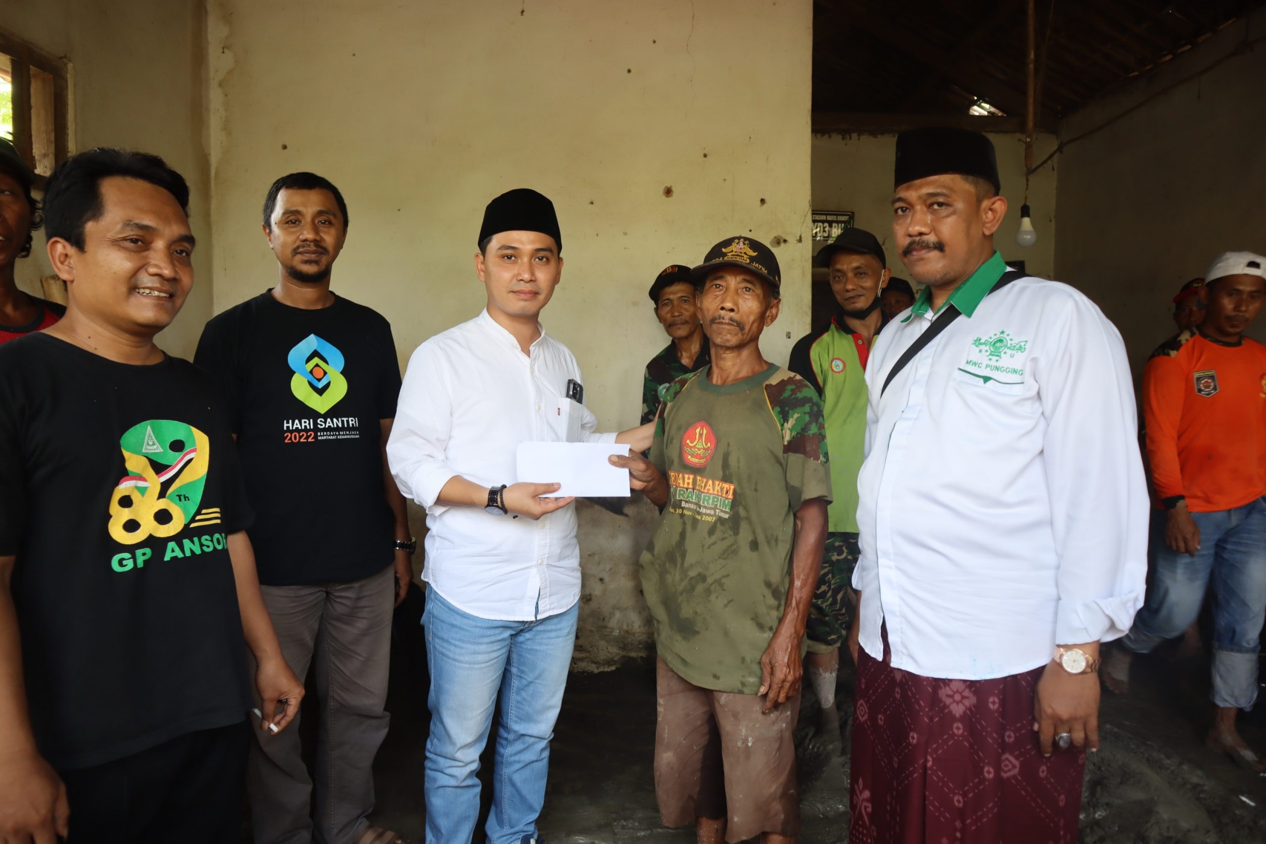 Mojokerto – Wakil Bupati Mojokerto, Muhammad Al Barra memberi bantuan berupa uang untuk perbaikan atau renovasi rumah tidak layak huni milik Kamun Anggota Banser yang tinggal di Dusun Pasinan Dadap Rt 49 Rw 12, Desa Sekargadung, Kecamatan Pungging Kabupaten Mojokerto, Minggu (30/10/2022).