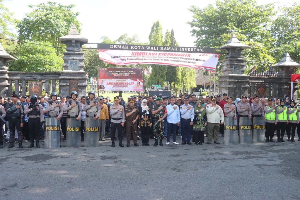 Simulasi Sistem Pengamanan Kota (Sispamkota) tersebut dilaksanakan di kompleks Kantor Bupati Demak, Kamis (23/4/2026). Dalam skenario yang diperagakan, ribuan massa melakukan aksi unjuk rasa menuntut penurunan harga bahan pokok. Aksi yang semula berjalan damai kemudian digambarkan berubah menjadi ricuh, ditandai dengan dorong-dorongan, pelemparan batu, hingga pembakaran ban di lokasi aksi.