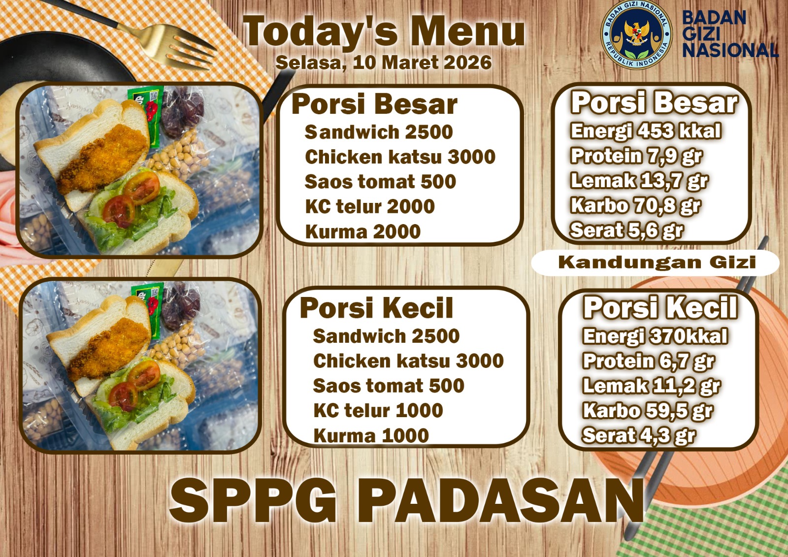 Pada hari tersebut, SPPG Padasan di Kecamatan Pujer, Kabupaten Bondowoso menyalurkan paket makanan berupa sandwich chicken katsu yang dilengkapi saus tomat, kacang telur, serta kurma. Susunan menu tersebut dirancang untuk memberikan asupan gizi seimbang bagi anak-anak sebagai bagian dari upaya mendukung kesehatan serta perkembangan mereka.