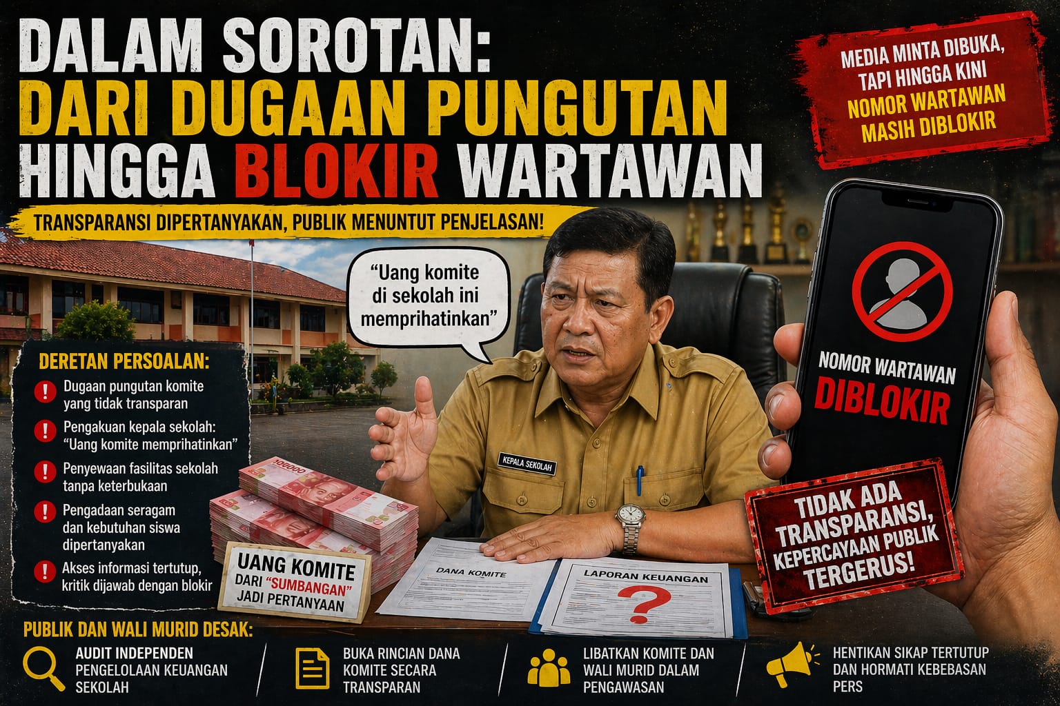 Permasalahan mencuat setelah adanya dugaan pungutan komite yang dinilai tidak transparan. Kepala sekolah, saat ditemui pada Senin (20/4/2026), mengakui kondisi dana komite di sekolah tersebut “memprihatinkan”. Namun, pernyataan itu tidak disertai penjelasan detail mengenai jumlah dana, mekanisme pengumpulan, maupun penggunaannya.