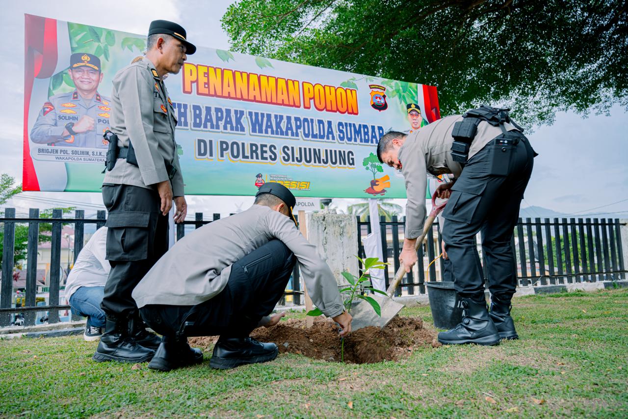 Usai penyambutan, kegiatan dilanjutkan dengan penanaman pohon di area Mapolres Sijunjung, tepatnya di sekitar lapangan apel. Brigjen Pol Solihin bersama jajaran turun langsung menanam bibit pohon sebagai bentuk komitmen terhadap pelestarian lingkungan. Langkah ini tidak sekadar seremonial, melainkan bagian dari upaya konkret menghadapi tantangan perubahan iklim sekaligus menanamkan kesadaran ekologis di lingkungan institusi kepolisian.