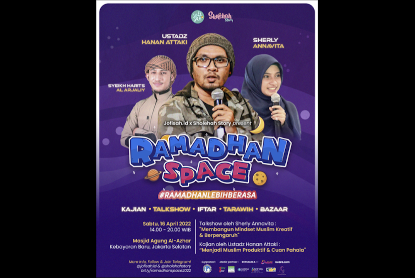 Acara Ramadan Space pada hari ini juga menghadirkan narasumber lain, seperti Ustadz Hanan Attaki dan Syaikh Harits Al-‘arjaliy. Ustadz Hanan Attaki akan membawakan kajian dengan tema “Menjadi Muslim Produktif dan Cuan Pahala.” Acara juga bisa ditonton secara virtual di kanal YouTube Republika Official dan Khazanah Network.